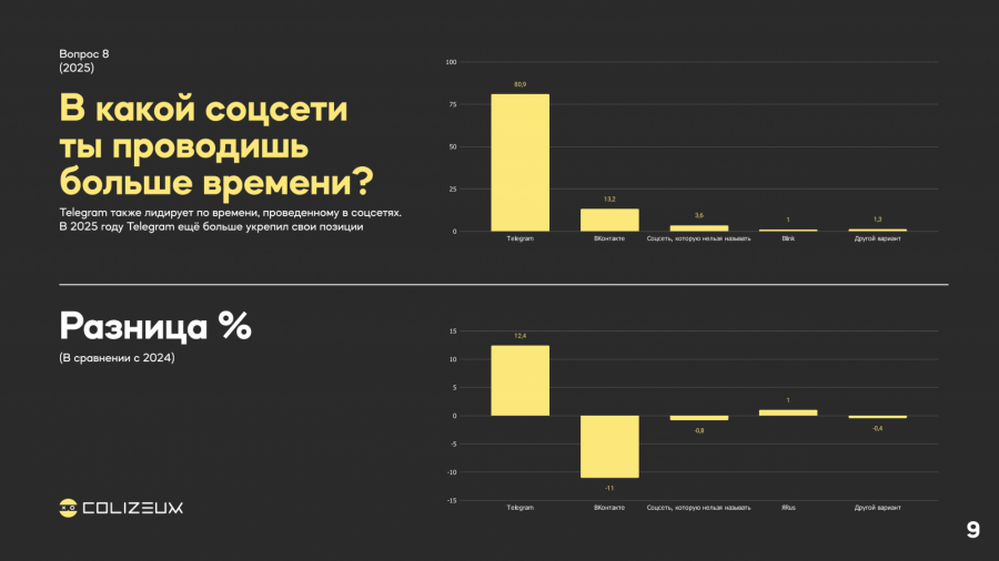 Telegram по-прежнему остается самым популярным средством общения среди гостей (79,5%). По сравнению с 2024 годом этот показатель вырос на 10%. Согласно опросу, после блокировки Discord в октябре 2024 года 62,5% геймеров перешли общаться именно в мессенджер. Сейчас это одна из главных площадок для коммуникации с гостями. В Telegram можно запускать чат-боты с промокодами или эксклюзивными предложениями, а также повышать узнаваемость бренда через размещение посевов в группах, популярных у целевой аудитории.