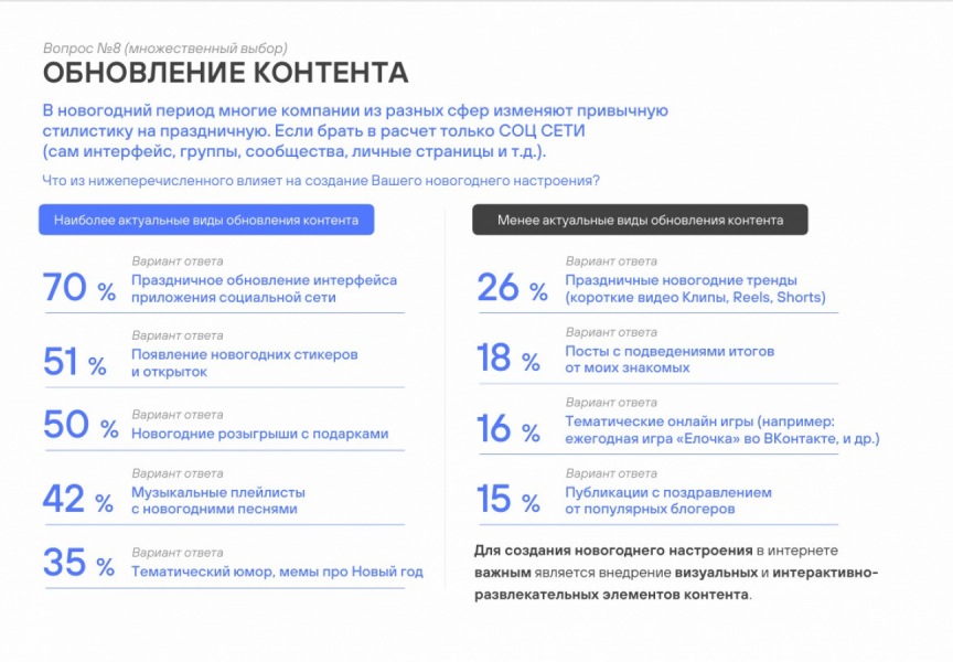 70% респондентов отметили, что праздничное обновление интерфейсов помогает создать нужную атмосферу, 51% голосов набрали новогодние стикеры и открытки. Почти столько же — 50% — голосуют за новогодние розыгрыши с подарками. Топ-5 наиболее актуальных видов праздничного контента замыкают плейлисты с новогодними песнями (42%) и мемы про Новый год (35%).