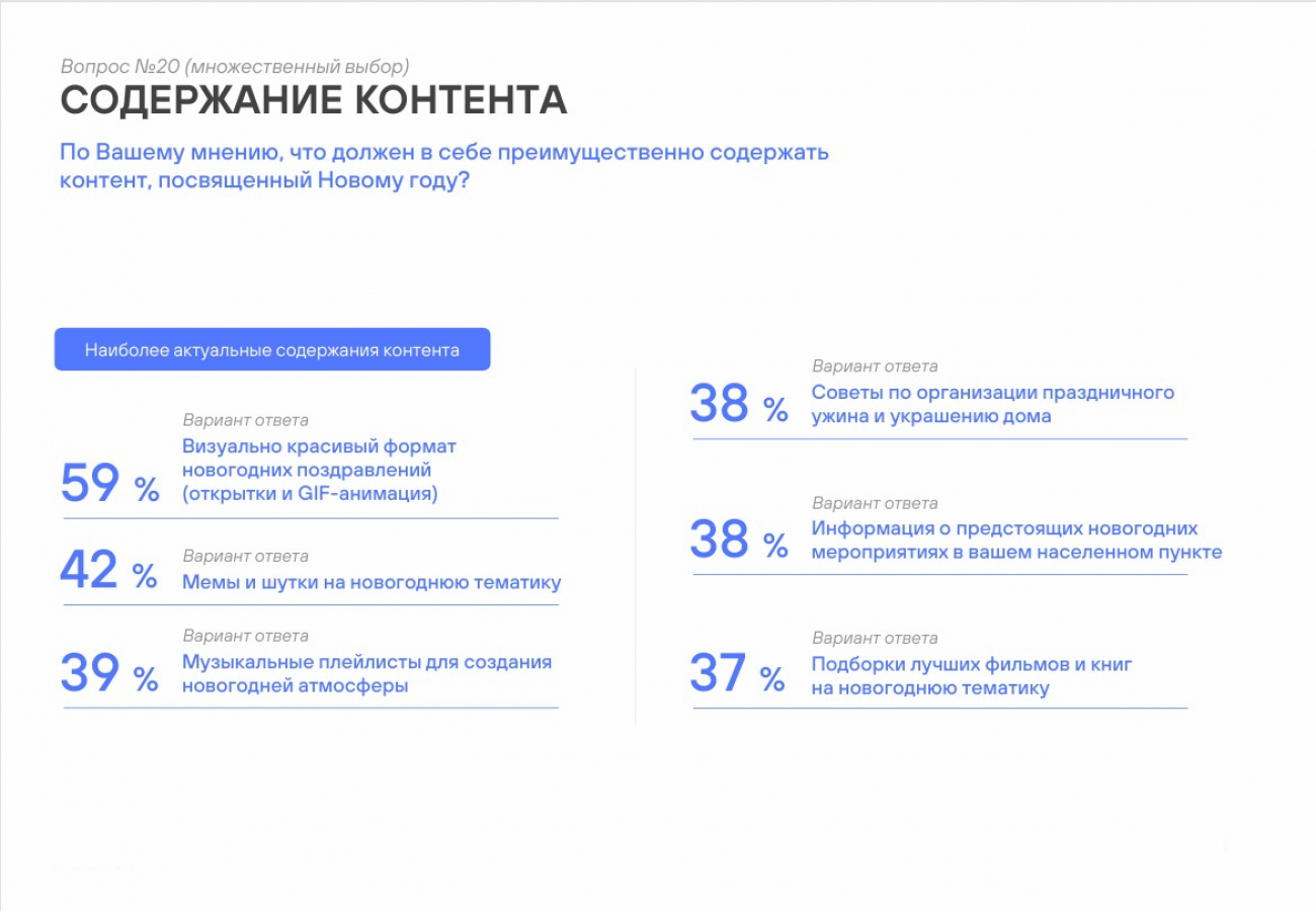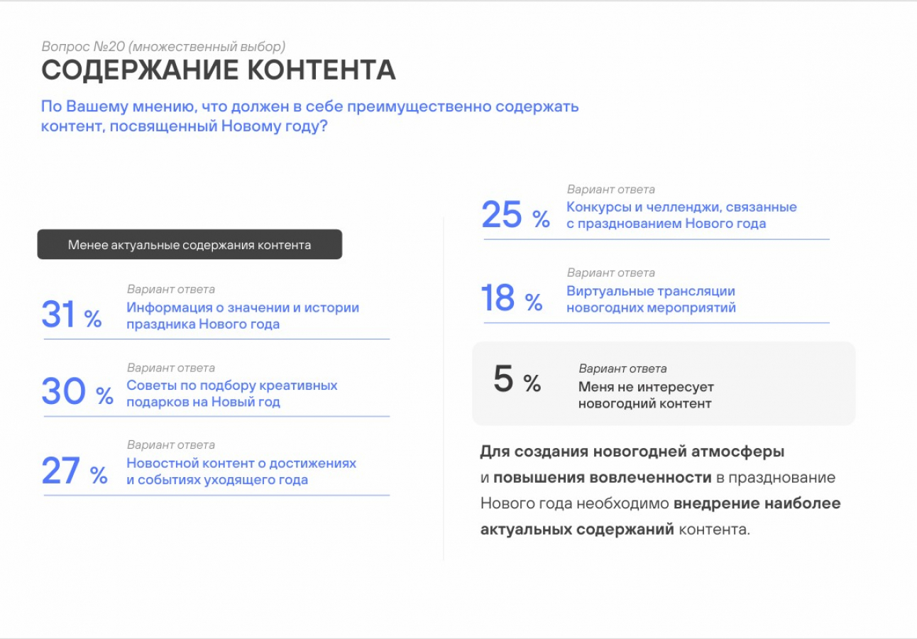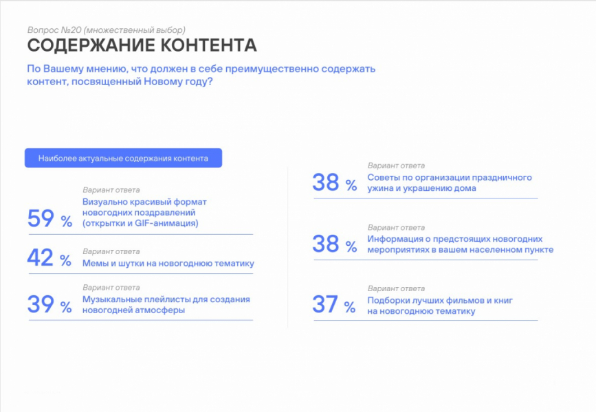 Менее актуальные варианты для россиян — праздничные новогодние тренды в формате видео (Клипы, Reels, Shorts), такому контенту отдано всего 26% голосов. Посты с подведением итогов года отметили 18% опрошенных. О тематических онлайн-играх вспомнили 16% респондентов, а поздравления от блогеров создают новогоднее настроение только для 15%.