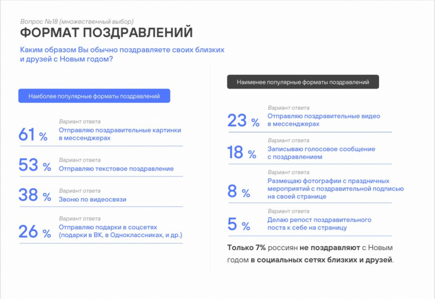 Респондентов спросили, как они предпочитают поздравлять близких в Новый год. 61% участников исследования сообщили, что отправляют праздничные открытки в мессенджерах, 53% выбирают текстовые сообщения, а 38% используют видеосвязь, чтобы поддерживать личный контакт. 26% предпочитают отправлять подарки в соцсетях (подарки в «ВК», «ОК» и прочие). При этом менее популярными остаются видеоролики с поздравлениями (23%) и голосовые сообщения (18%). Еще 8% респондентов сообщили, что они постят фотографии с праздничных мероприятий, сопровождая их поздравительной подписью, а 5% делают репост поздравительных публикаций.