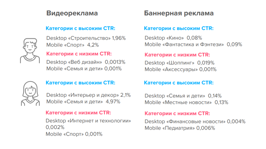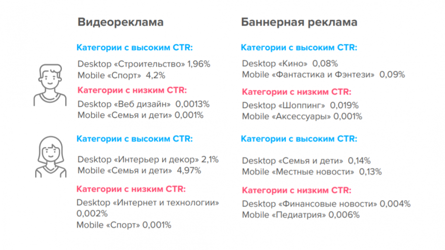 По данным исследования Getintent, пользователи реагируют на баннерную рекламу примерно одинаково, независимо от гендера. Это можно объяснить наличием общей «баннерной слепоты» у пользователей. А вот видеореклама — особенно показанная в контенте — более заметна. Женщины склонны кликать на неё чаще.