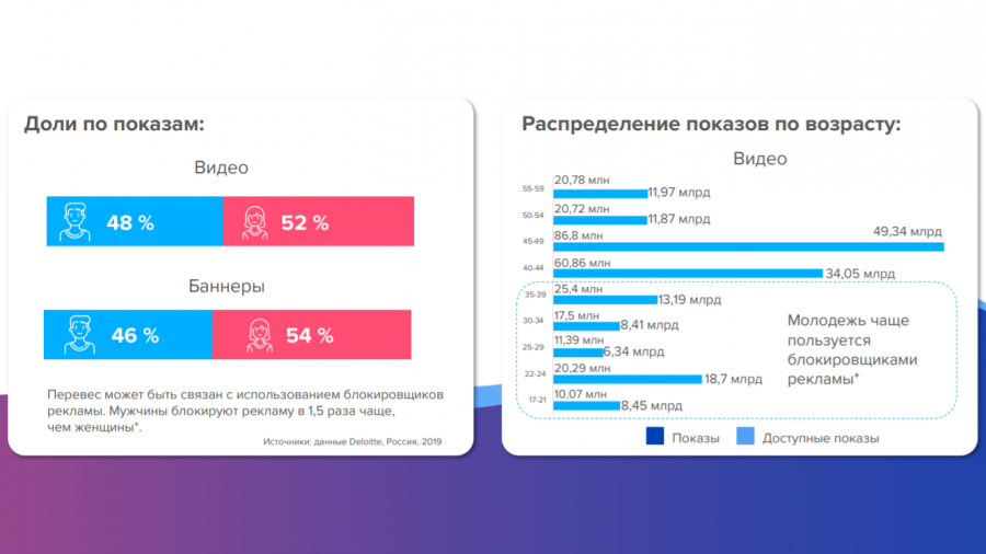 При этом доля показов рекламы среди женщин немного выше, чем среди мужчин. Одна из причин такой тенденции может быть в том, что мужчины блокируют рекламу в полтора раза чаще, чем женщины. А наибольшее количество показов приходится на более возрастную аудиторию — 40−50 лет. Скорее всего, это связано с тем, что молодежь всё меньше занимается сёрфингом в интернете и всё больше времени проводит в соцсетях: TikTok, Instagram и YouTube.