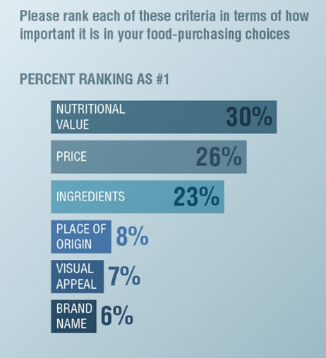 Естественным будет предположить, что бренды перестают играть большое значение в выборе еды. Исследование эту мысль подтверждает. Участникам опроса предложили проранжировать шесть основных показателей, которые влияют на решение о покупке. Имя бренда на первое место в списке поставили в мире всего 6 человек из 100, в России – меньше трёх. Наши покупатели обращают гораздо больше внимания на ингредиенты, их питательную ценность и место происхождения.