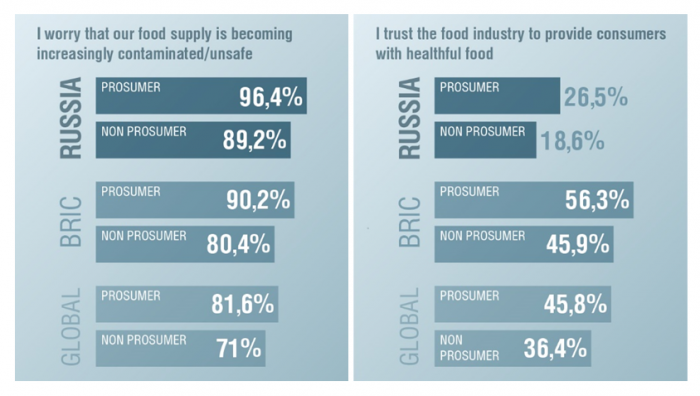 Несмотря на то, что современные потребители во всём мире обеспокоены тем, что еда становится небезопасной, в России с таким утверждением согласны почти 100% опрошенных, что на 15% превышает среднее значение по миру. С уровнем доверия к отрасли в целом дела в нашей стране обстоят ещё хуже. Всего 26% доверительно относятся к индустрии, и это почти в половину меньше среднего глобального показателя.