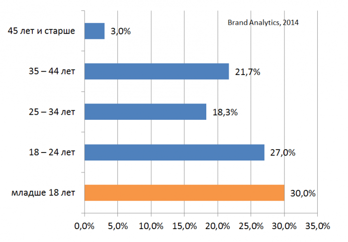 Наибольшей популярностью Хэллоуин пользуется у школьников – 30% аудитории младше 18 лет. Чуть меньшую долю занимают «студенты»: в возрастную категорию «от 18 до 24 лет» попали 27% пользователей. Интересно, что старшие поколения почти не интересуются модным праздником – всего 3% авторов перешли рубеж 45 лет.