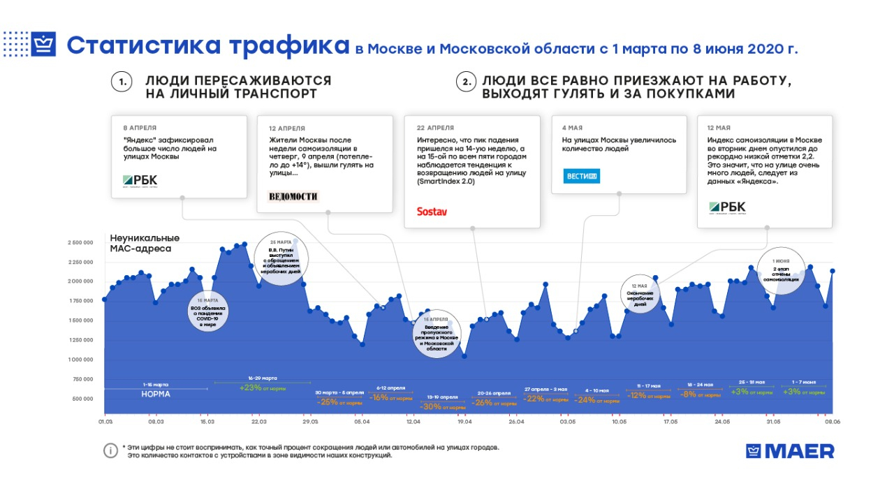 Данные получены с помощью уличных экранов, оборудованных WiFi-комплексами. Они фиксируют МАС-адреса мобильных устройств, передвигающихся в общем потоке в зоне видимости оборудования.