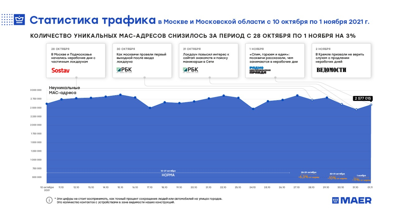 По данным оператора наружной рекламы Maer (есть в распоряжении Sostav), в первые дни локдауна с 28 октября по 1 ноября 2021 года московский наземный трафик снизился на 10−11%.