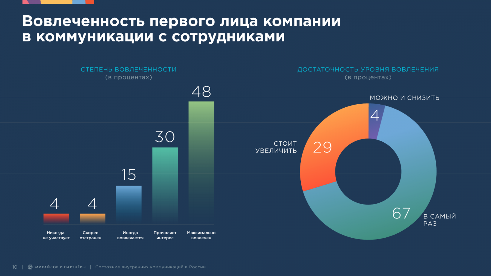 Также в 78% компаний генеральный директор активно участвует в коммуникациях с сотрудниками, а 29% опрошенных даже хотели бы, чтобы глава компании был более вовлечён в этот процесс. Порядка 4%, наоборот, хотели бы снизить активность гендиректора в общении с работниками.