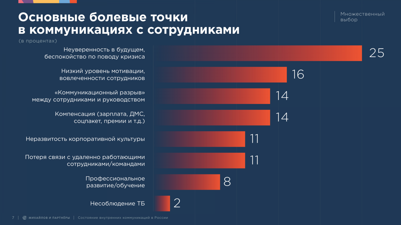 Главными проблемами в коммуникациях с сотрудниками представители бизнеса называют неуверенность в будущем и беспокойство сотрудников по поводу кризиса — 25%, низкий уровень мотивации и вовлеченности сотрудников — 16%, вопросы компенсаций (зарплата, ДМС, соцпакет, премии) — 14%. О наличии «коммуникационного разрыва» между сотрудниками и руководством говорят всего 14% респондентов.