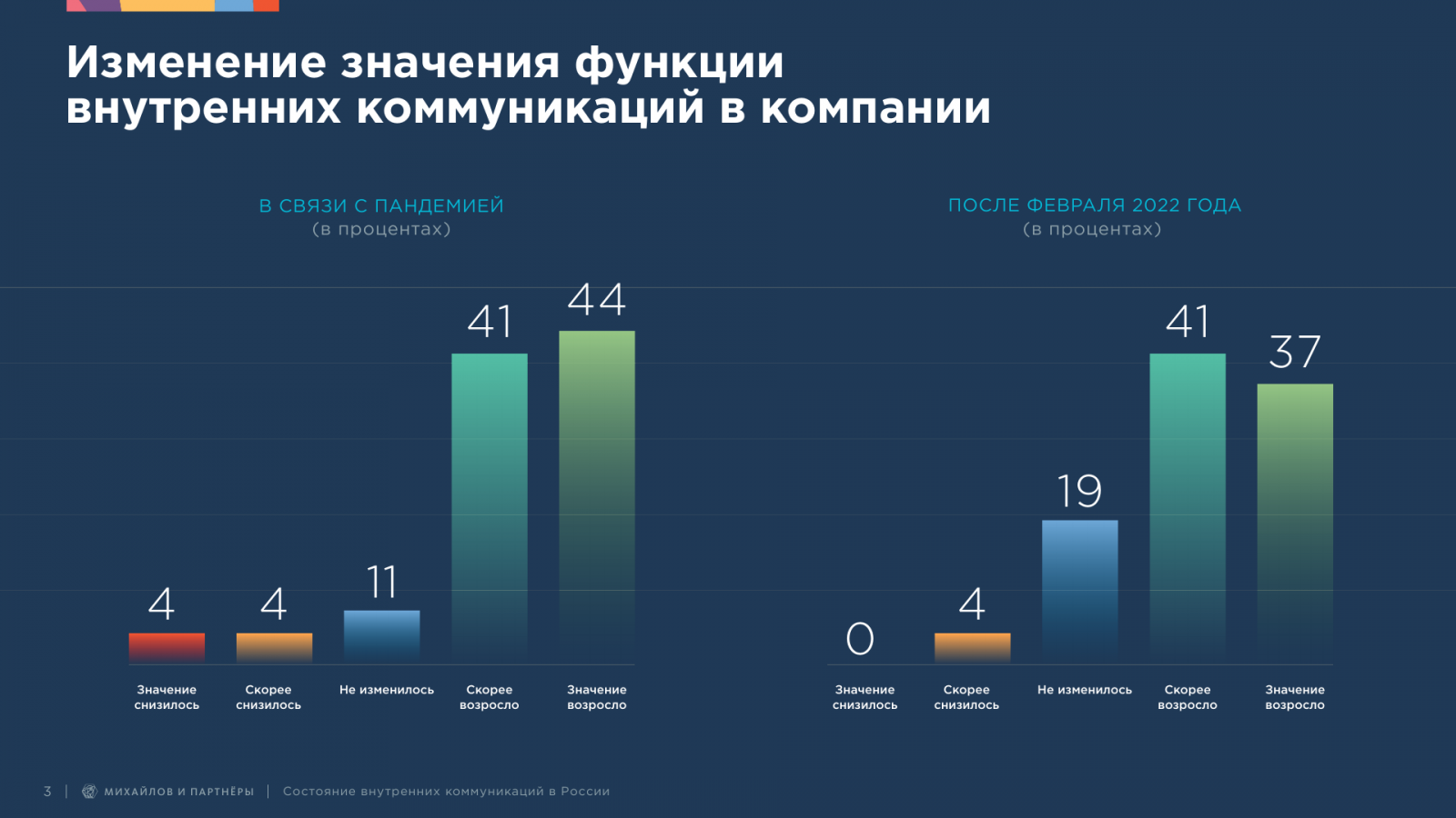По данным исследования компании «Михайлов и партнёры», в российских организациях в период пандемии и после февраля 2022 года почти в два раза выросло значение внутренних коммуникаций. При этом 7% респондентов из бизнес-среды заявили, что находятся в перманентном кризисе коммуникаций с сотрудниками. В опросе приняли участие директора и руководители по HR и PR крупнейших российских компаний из различных отраслей экономики. Результаты имеются в распоряжении Sostav.