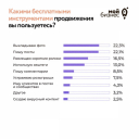 Платные инструменты продвижения используют 69% предпринимателей. В топе по популярности таргетированная реклама в соцсетях — её выбирают 27% участников опроса. Платные посты в сообществах и каналах используют 16%, а рекламу у инфлюенсеров — 13%.