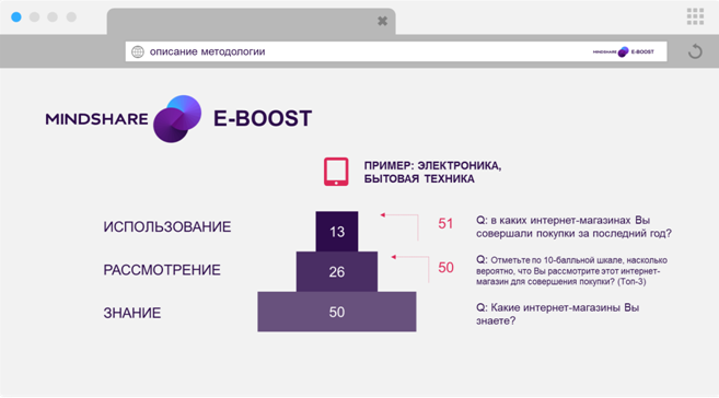 Система позволяет анализировать ключевые бренд-индикаторы. В основе подхода – трекинг бренд-индикаторов «знание-рассмотрение-использование». Исследование покрывает 97 брендов в 9 категориях электронного бизнеса, данные собираются на еженедельной основе, что дает возможность оценить эффект конкретных кампаний и сформировать бенчмарки для планирования. Аудитория опроса: мужчины и женщины, 20-54 лет, жители городов 1 млн+.