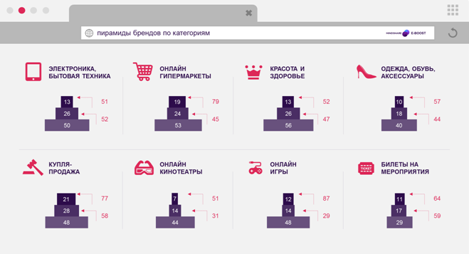 Согласно трекингу, наиболее сильные пирамиды бренда наблюдаются в категориях: “Купля-продажа”, “Онлайн Гипермаркеты”, “Электроника и бытовая техника”, а также “Красота и здоровье”. Услуги этих категорий востребованы у широкой аудитории, а также их представители давно активно рекламируются в офлайн. Все это находит отражение в высоких уровнях конверсии между уровнями пирамиды.