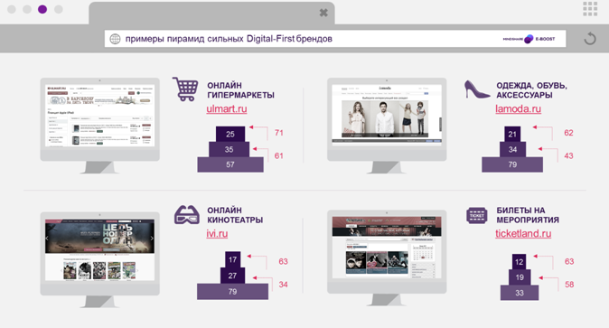 Анализ пирамиды бренда дает ключ к пониманию, какую стратегию работы с аудиторией необходимо выстраивать. К примеру, для брендов категории “Купля-Продажа” основным источником развития остается рост ЗНАНИЯ и соответственно использование массовых каналов коммуникации. В то же время для продвижения в сегменте онлайн-кинотеатров необходимо использовать более таргетированный подход в работе с аудиторией.