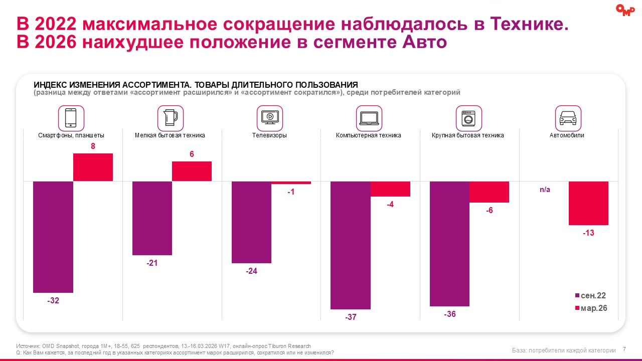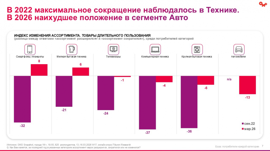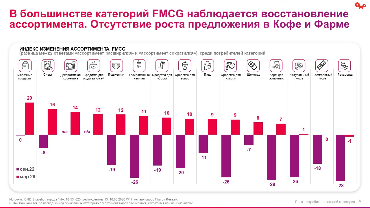 Большинство респондентов фиксируют уверенное восстановление ассортимента. Если в сентябре 2022 года потребители отмечали сокращение предложения во всех категориях без исключения, то к 2026 году ситуация изменилась: рост доступности товаров виден во всех сегментах FMCG (за исключением кофе), а также в категориях смартфонов и мелкой бытовой техники. При этом в лекарственных препаратах, крупной бытовой технике и электронике все еще сохраняются признаки спада, а антилидером по темпам восстановления является авторынок.