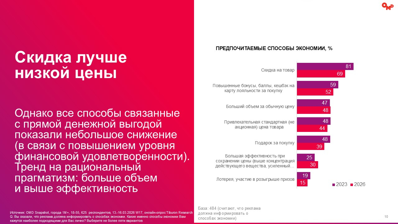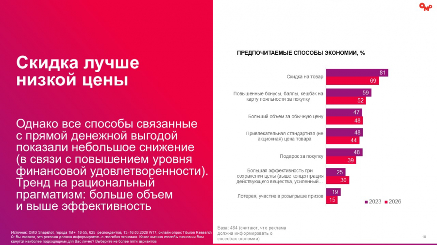 Как и прежде, самой востребованной выгодой остается прямая скидка, хотя ее значимость с 2023 года заметно снизилась: с 81% до 69% в 2026-м. Финансово устойчивые респонденты чаще предпочитают альтернативные механики экономии. С учетом того, что доля обеспеченных россиян (самооценка) за этот период выросла с 30% до 42%, их предпочтения меняют усредненное представление о выгоде различных предложений. Из значимо растущих способов экономии является только «большая эффективность при сохранении цены» (30% против 25%).