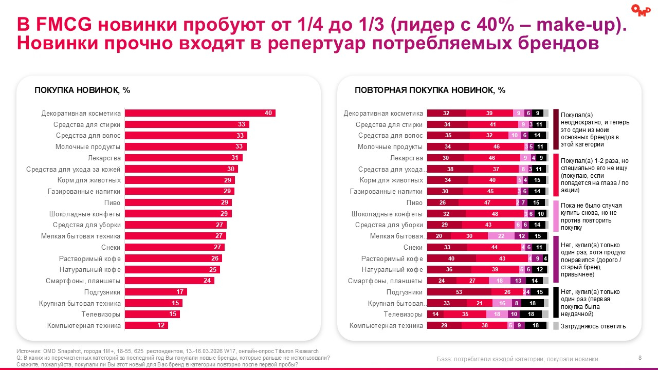 Объективно, новинок на рынке много во всех категориях. Потребители их охотно пробуют. За год новые бренды для себя открыли от 1/4 до 1/3 потребителей, в зависимости от категории. Выделяется декоративная косметика, где показатель составляет 40%. Новинки чаще всего приходятся по вкусу и входят в привычный репертуар брендов (в среднем 70% продолжают покупать их на регулярной основе или эпизодически).