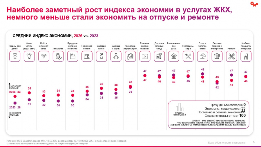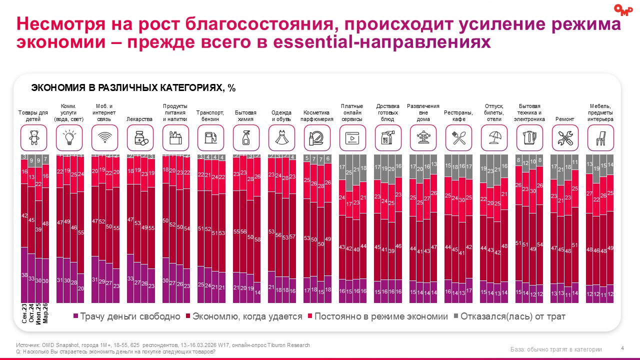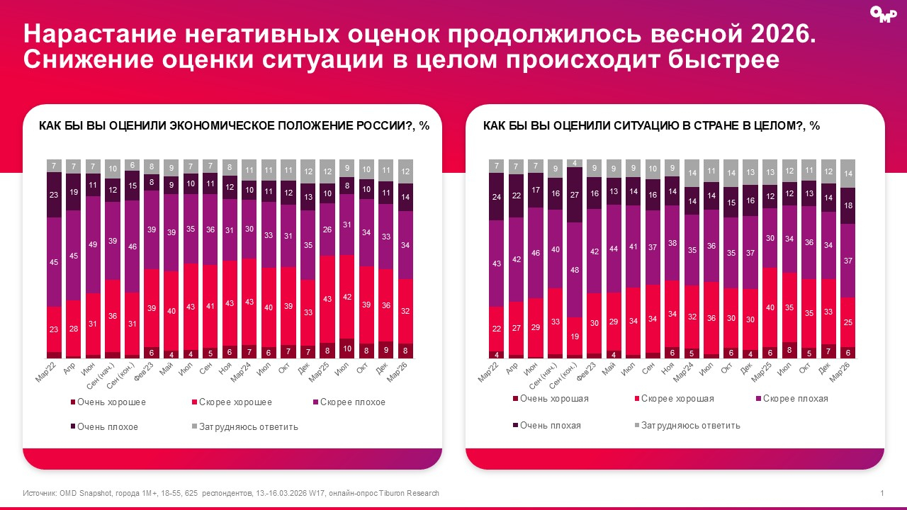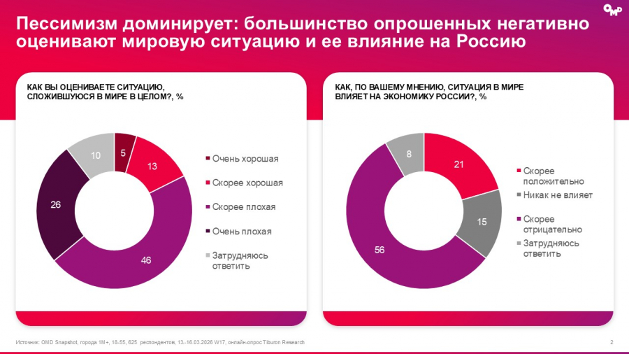 После марта 2025 года, когда был зафиксирован максимальный уровень позитивных потребительских настроений, начался постепенный откат, который ускорился в марте текущего года. Ко всем прочим факторам добавилась нестабильная обстановка в мире, которая, по мнению большинства респондентов (56%), негативно сказывается на экономике России.