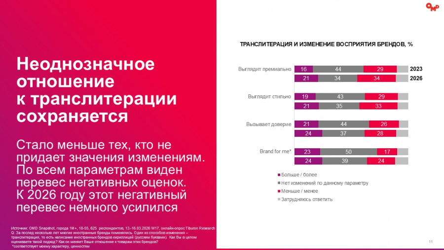 Новый виток транслитерации, в этот раз вызванный законодательными изменениями, а не локализацией брендов, привел к ухудшению отношения респондентов к кириллице. Большинство, как и в 2023, все еще считает, что алфавит не влияет на восприятие брендов, однако перекос в негативные оценки стал более выражен. Обеспеченные потребители менее чувствительны к неймингу: вероятно, фокус на качестве продукта позволяет им спокойнее принимать изменения в его внешнем позиционировании.