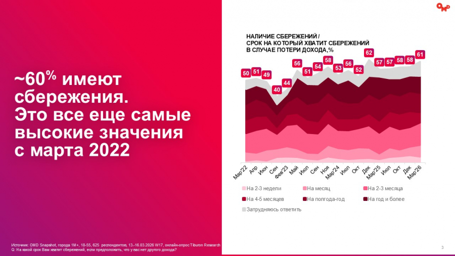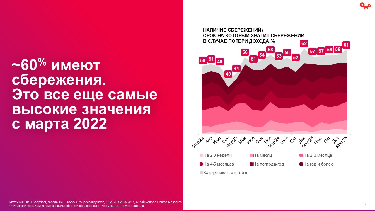 Несмотря на то, что нарастает ощущение неопределенности и потребители все менее оптимистично смотрят на будущее состояние экономики и свои доходы, текущая финансовая удовлетворенность респондентов все еще находится на максимальных уровнях за все время замера (с марта 2020). Также на стабильно высоком уровне с декабря 2024 года находится доля респондентов, имеющих сбережения (61%). Это подтверждает сообщения ЦБ о рекордном объеме средств и на банковских вкладах (₽67.2 трлн) и объеме наличных сбережений на руках у населения (₽17.1 трлн).