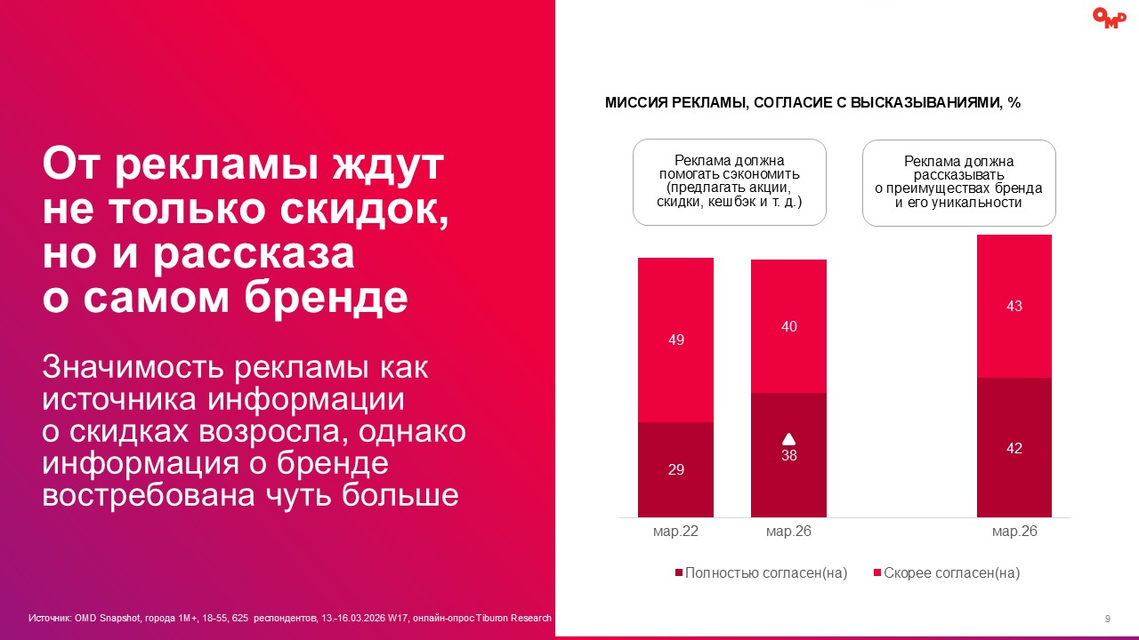 За время турбулентности на потребительском рынке, связанной с уходом брендов и локализацией, потребитель стал больше обращать внимание на рекламу, воспринимая ее как навигатор в новой реальности. Выросла и значимость рекламы как источника информации о способах сэкономить. Однако от рекламы ждут не только выгодных предложений, но собственно рассказа о бренде и его преимуществах.