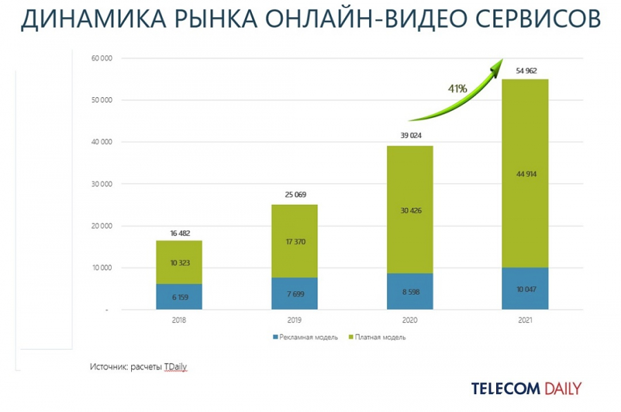 Согласно данным отчёта «Рынок онлайн-видео 2020−2021» TelecomDaily, в 2021 году выручка онлайн-кинотеатров выросла на 41% и составила почти 55 млрд руб. С 2019 по 2020 годы рост выручки достигал 56%, а с 2018 по 2019 — 52%. При этом сложная экономическая ситуация и видеопиратство не повлияли на показатель — рост достигнут за счёт привычки пользователей к услугам видеосервисов, а также продления удалённой работы. Этими и другими выводами исследования в TelecomDaily поделились с Sostav.