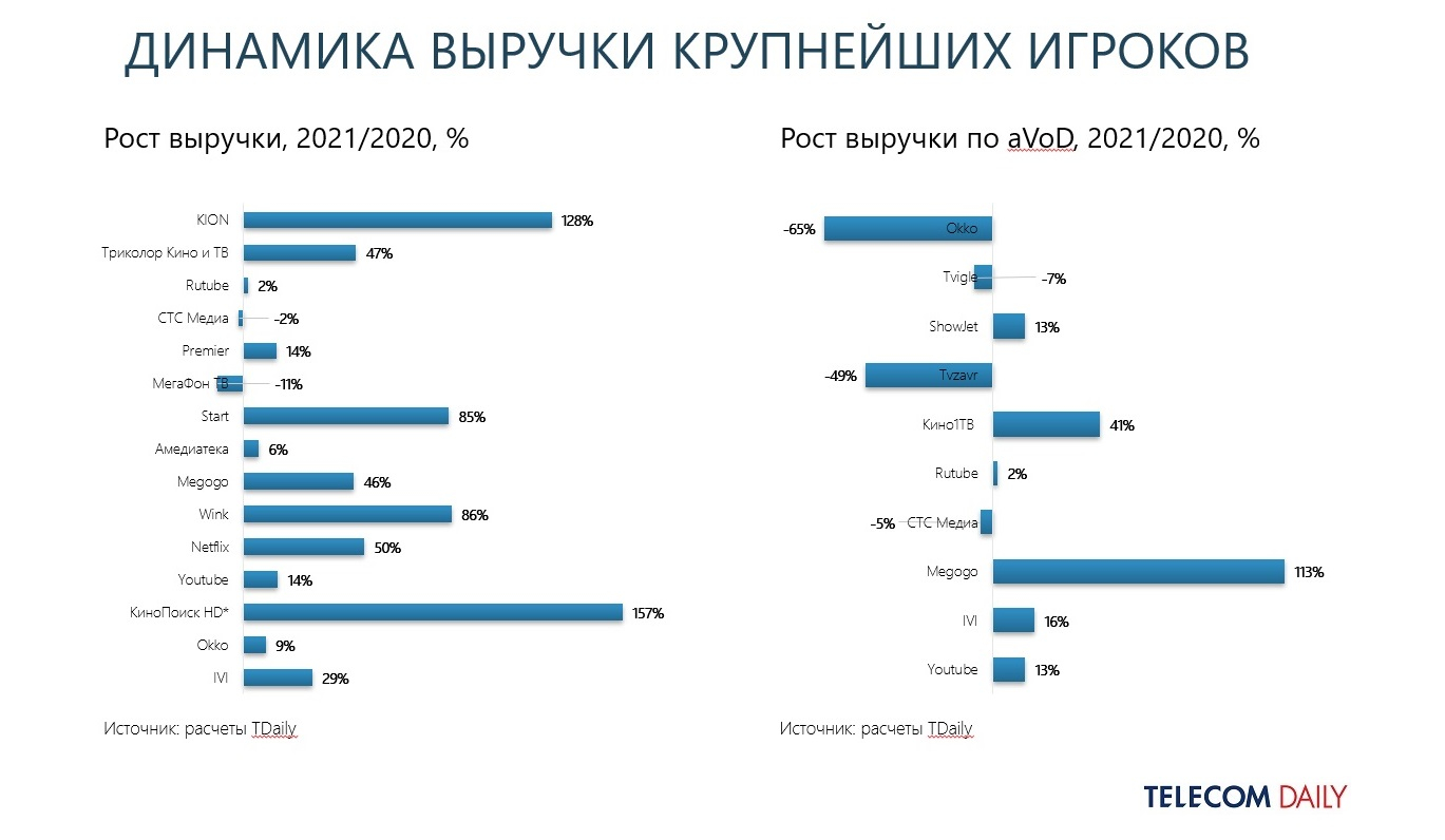 В денежном выражении самый активный рост зафиксирован у «Кинопоиска» — 157%, у принадлежащего МТС Kion — 128% (его доля в общей выручке — 0,8%), у Wink — 86%, у Start — 85%, у Netflix — 50%, у «Триколор Кино и ТВ» — 47%.