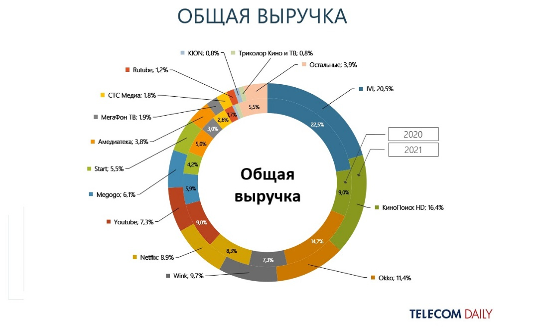 Лидировал на рынке онлайн-кинотеатр Ivi, хотя и снизил свою долю с 22,5% до 20,5% по итогам года. «Кинопоиск» нарастил выручку почти в два раза — до 16,5% (в конце 2020 — 9%). У Okko за тот же период доля составила 11,4% (в 2020 —14,7%).