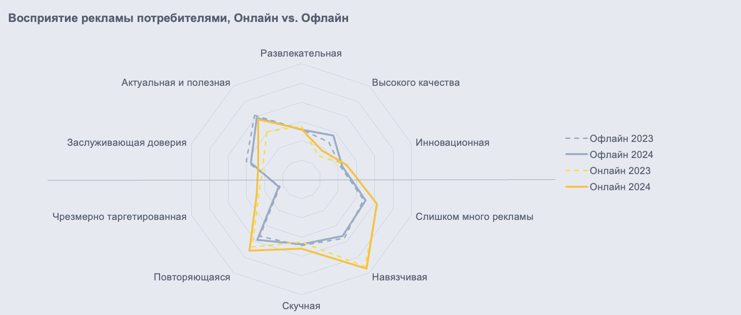 Треть респондентов посчитали онлайн-рекламу навязчивой. Такая тенденция подчёркивает необходимость более тонкого подхода к созданию и показу рекламы — она должна быть полезной и интересной для аудитории.