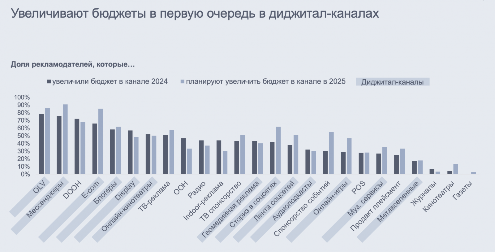 Оценка эффективности медиаканалов по-прежнему вызывает трудности у маркетологов. Особенно это актуально для цифровых каналов, где со сложностями в оценке сталкиваются 65% специалистов. Несмотря на это, рекламодатели продолжают наращивать бюджеты на диджитал-форматы, такие как OLV и мессенджеры. В 2024 году доля рекламодателей, которые увеличили бюджет на эти форматы, составила 78 и 76%, в 2025 году будет равна 85 и 91% соответственно.
