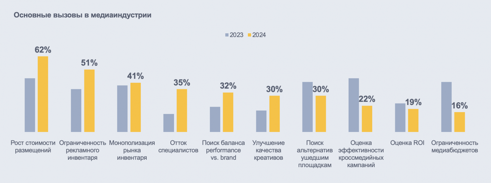 Представители разных сфер маркетинга перечислили основные вызовы в медиаиндустрии в 2024 году. 62% опрошенных назвали рост цены размещения, 51% — ограниченность рекламного инвентаря, 41% — монополизацию рынка инвентаря. Таковы данные исследования «Медиавзгляд» компании