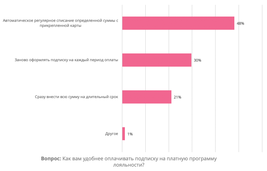 Большинство (69%) пользователей платных программ лояльности не хотят прикладывать дополнительных усилий для оплаты участия в программе: 48% опрошенных предпочитают автоматическое списание с карты, а 21% сразу вносит всю сумму на длительный срок.