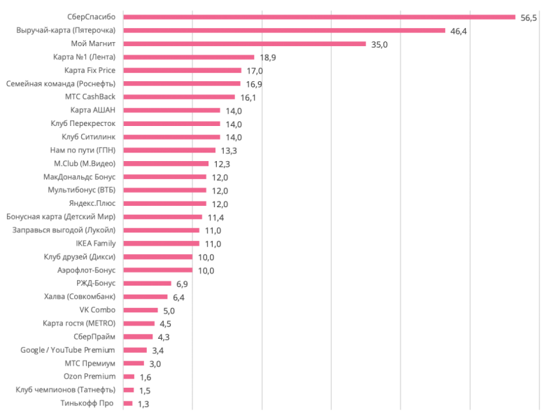 По данным исследования, по итогам 2021 года на российском рынке действовало более 60 крупных программ лояльности (с числом участников более 1 млн). Несмотря на то, что в первом квартале 2022 года некоторые из них стали временно недоступны в России («Макдоналдс Бонус», IKEA Family), в целом объем рынка программ лояльности не изменился.