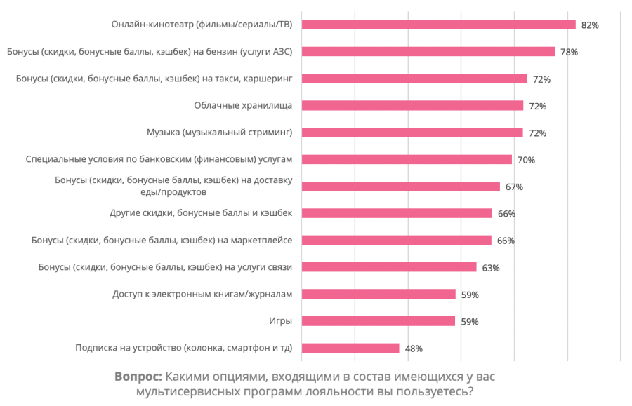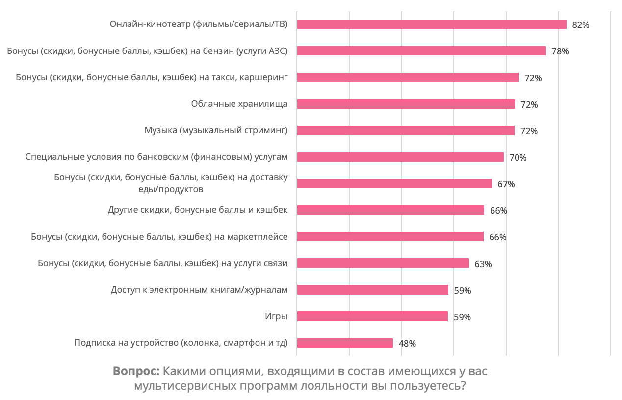 Мультисервисные подписки удобны тем, что позволяют закрыть сразу несколько потребностей клиента в одном месте, сделали вывод эксперты. Так, респонденты отметили, что чаще всего в таких подписках пользуются онлайн-кинотеатрами (82%), бонусами на услуги АЗС (78%), а также музыкальными стримингами, облачными хранилищами и бонусами на такси и каршеринг (по 72%).