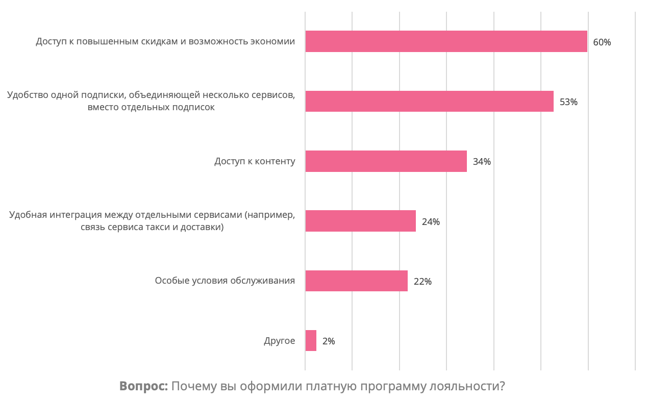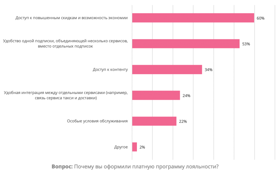 Главной причиной оформить платную программу лояльности для россиян стала выгода: 60% отметили доступ к повышенным скидкам и возможность экономии. Второй по важности критерий — удобство одной подписки, которая объединяет несколько сервисов — так ответили более половины респондентов (53%). При этом каждый третий (34%) оплачивает программу лояльности, чтобы получить доступ к контенту.