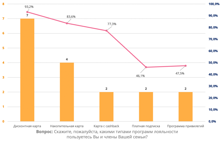Самым распространённым типом программ лояльности оказались дисконтные карты магазинов: ими пользуются 93% опрошенных. Вторую строчку заняли накопительные карты: их используют 83% респондентов. Третьи по популярности — карты с кэшбеком, которыми пользуется 77% опрошенных.