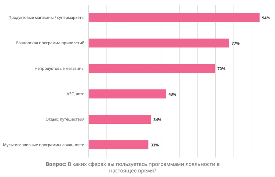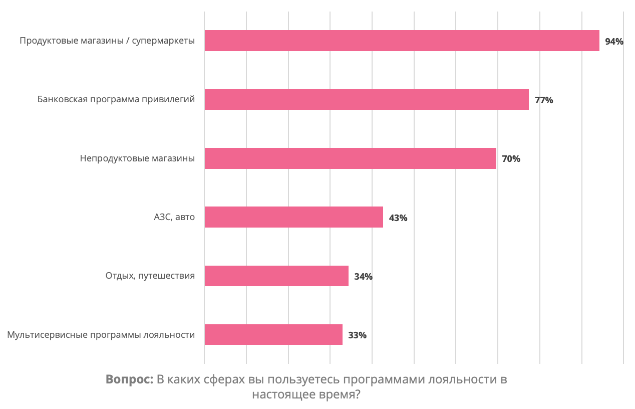 Кроме того, почти все участники опроса (94%) пользуются программами лояльности в продуктовых магазинах и супермаркетах. Также в топ-3 сфер использования вошли программы привилегий в банках (77%) и программы лояльности в непродуктовых магазинах (70%).