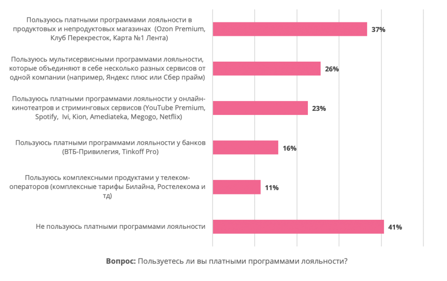 В последнее время стали популярны платные программы лояльности в разных сферах: от ритейла и телекома до банков и видеостриминга. Сегодня платными программами лояльности пользуются около 60% опрошенных.