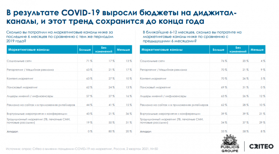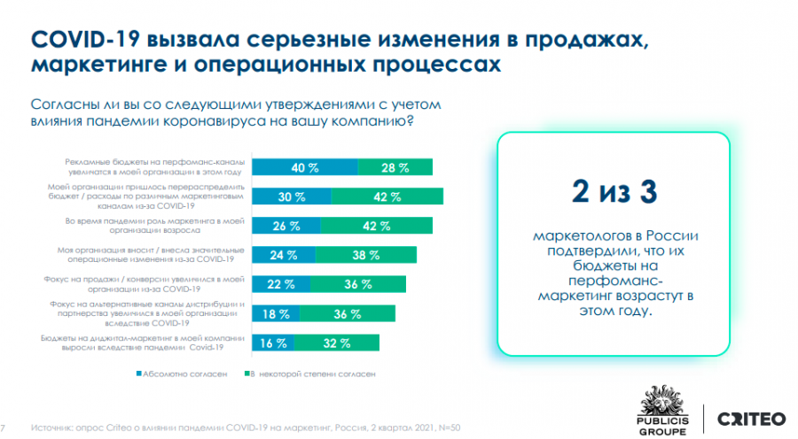 48% маркетологов в России подтвердили, что пандемия COVID-19 способствовала снижению доходов их компаний, при этом 36% отметили, что выросли онлайн-продажи. 94% опрошенных согласны с тем, что продажи на сайте являются ключевой метрикой, влияющей на маркетинговую стратегию. В связи с этим, компании все больше фокусируются на онлайн-продажах и привлечении трафика, увеличив бюджеты на digital-маркетинг в 2021 году. Об этом говорится в исследовании, проведенном технологической компанией Criteo совместно с