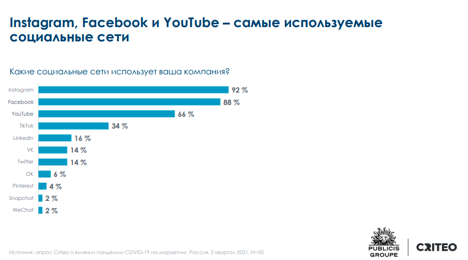 Среди самых используемых соцсетей для коммуникации с клиентами лидируют Instagram, Facebook и YouTube.