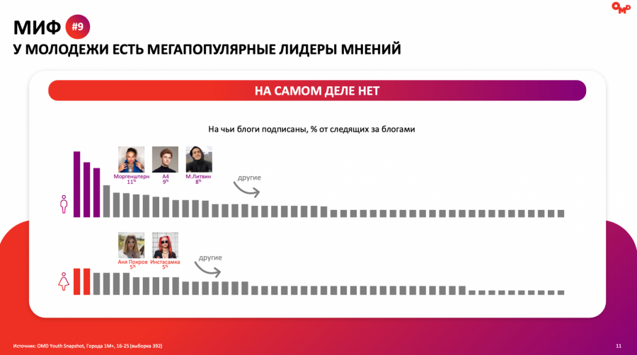 Миф 9: У молодежи есть мегапопулярные лидеры мнений