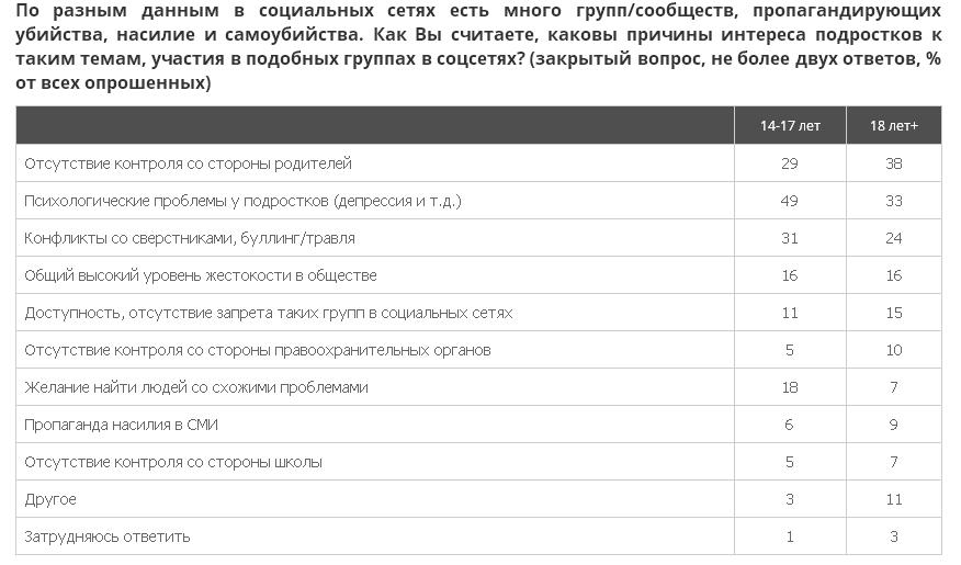 Основные причины интереса к подобным группам находятся за пределами онлайн-среды. Среди них — психологические проблемы самих подростков, отсутствие контроля со стороны родителей и конфликты со сверстниками. Участие в опасных группах как следствие проблем подростков в реальной жизни рассматривают более 50% опрошенных.