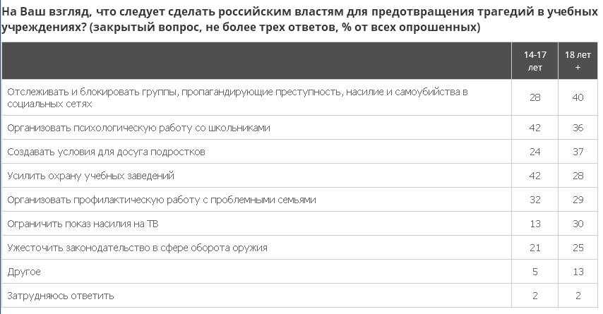 По мнению респондентов, чтобы предотвратить трагедии в учебных заведения, необходимо организовать психологическую работу со школьниками, усилить охрану учебных заведений и создать условияй для досуга подростков. Кроме того, обсуждение трагедий в учебных заведениях должно быть ограничено в ток-шоу на федеральных каналах. Так считает более 70% опрошенных.