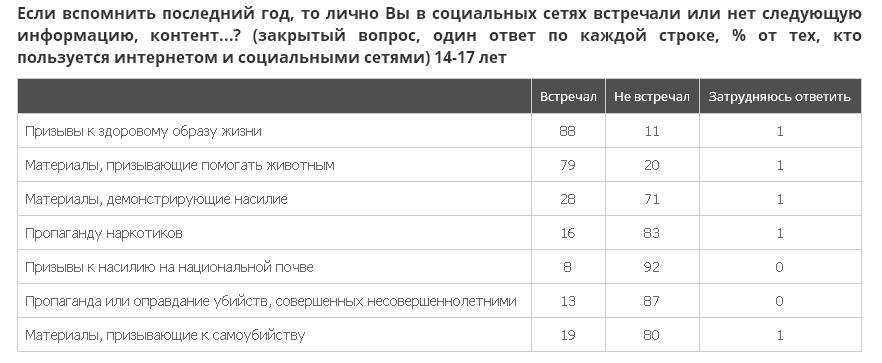 Среди пользователей социальных сетей старше 18 лет 17% отметили, что сталкивались с двумя и более сюжетами опасной повестки, а в группе подростков эта доля составляет 20%. В целом осведомленность об опасных группах в соцсетях (пропагандирующих самоубийства, насилие, терроризм) достаточно низкая и мало отличается среди подростков и населения в целом. Большинство же отметило, что сталкиваются с позитивными призывами, например, вести ЗОЖ, и помогать животным.
