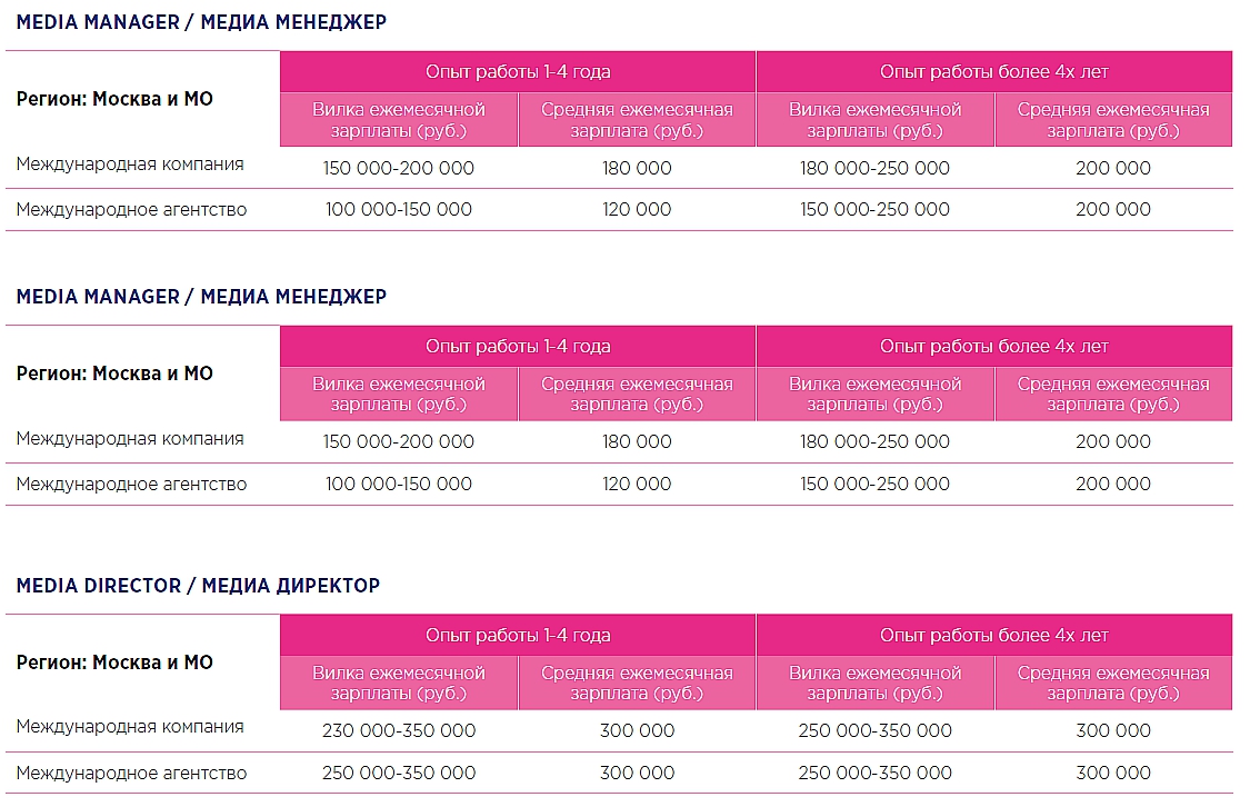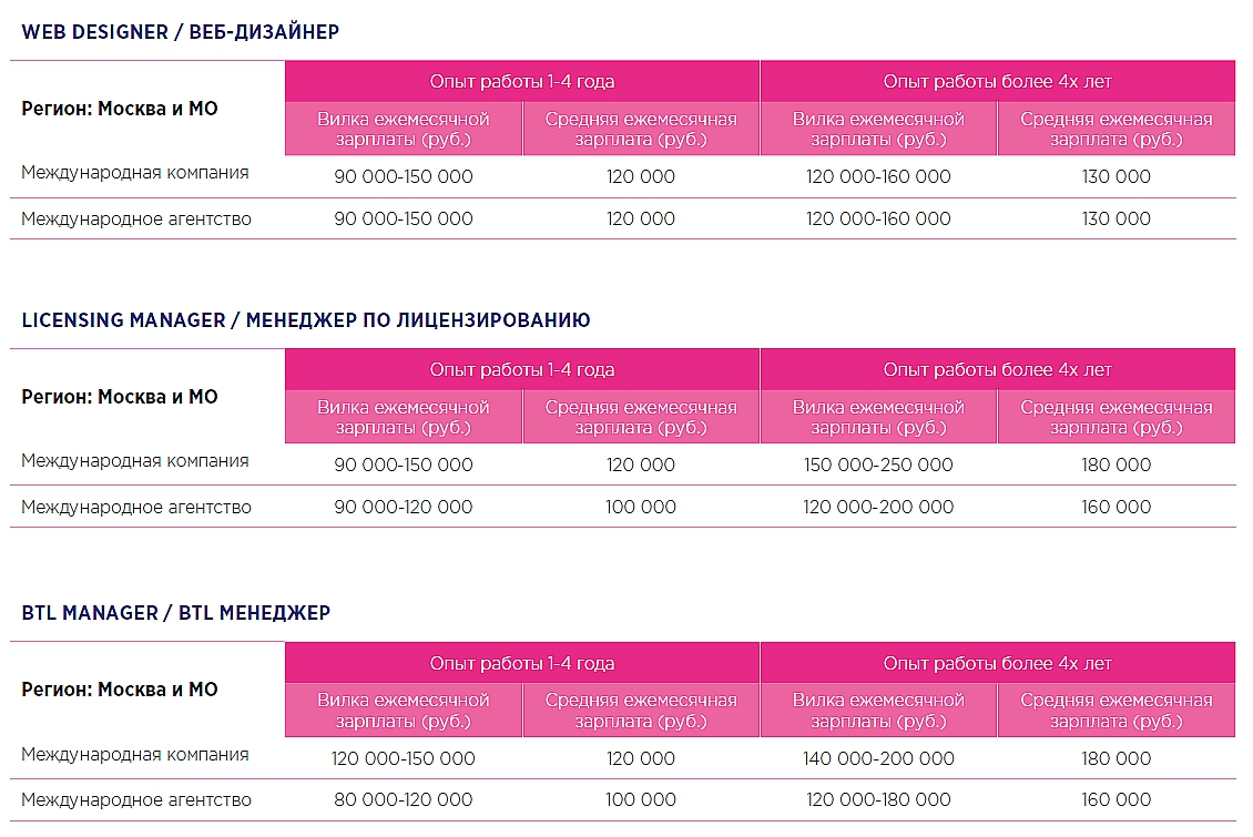 По типовым позициям в digital-маркетинге средняя зарплата специалиста на позиции digital manager составляла 160–180 тыс. рублей, при наличии опыта от 4-х лет — до 330 тыс. рублей. Начинающий SMM-менеджер может рассчитывать на зарплату 100–120 тыс. рублей, с опытом от 4-х лет — 160–180 тыс. рублей. Начинающий CRM-manager в 2017 году получал в среднем 110–140 тыс. рублей, с опытом от 4-х лет — 150–170 тыс. рублей. При этом зарплата на типовых позициях в агентствах может быть ниже на 5-10 %, чем в корпорациях, и выше на 5-25% на руководящих.