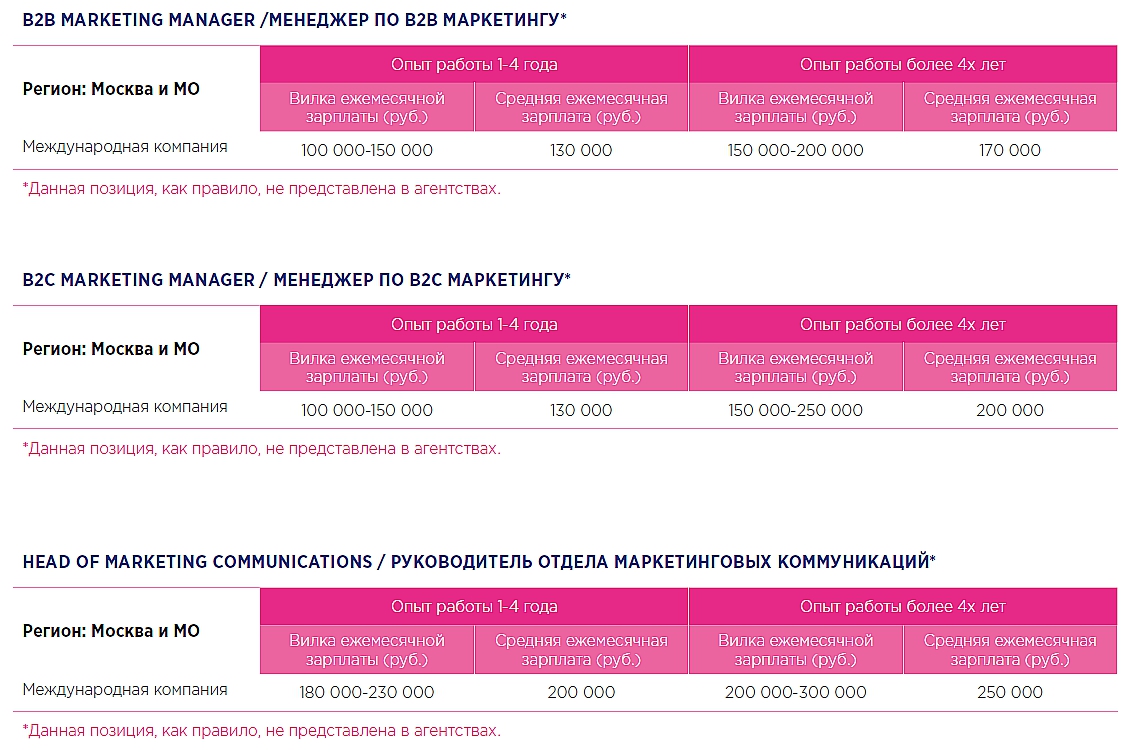 Уровень зарплат специалиста по маркетинговым коммуникациям несколько ниже, чем в PR. Так, специалист по B2B- и B2C-маркетингу в начале карьеры зарабатывал в среднем 120 тыс. рублей. При этом при достижении 4-летнего опыта перспективы значительного увеличения зарплаты ждут скорее специалиста в B2C. Руководитель отдела марком с опытом работы от 1 года до 4-х лет зарабатывал в среднем 200 тыс. рублей и может рассчитывать на 25%-ный рост зарплаты при наличии опыта управления командой.
