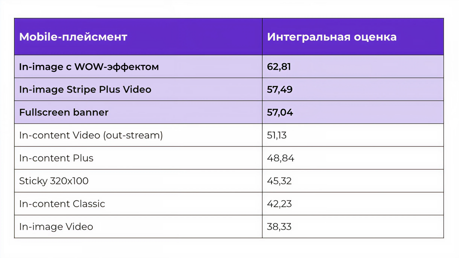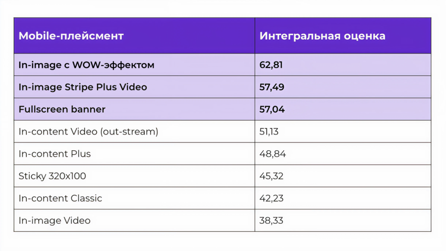 С учетом айтрекинга и QuizScore лидером по совокупной эффективности на mobile становится in-image с WOW-эффектом. Формат сочетает высокую заметность, достаточное время просмотра и наиболее позитивное восприятие в пост-опросе.