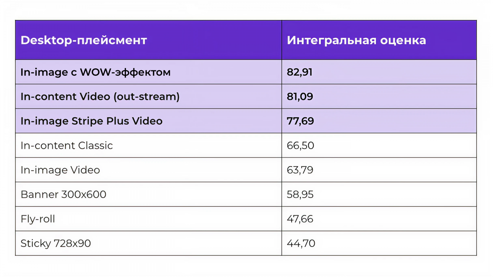 В частности, креатив In-content Video занял первое место, а In-image Stripe Plus Video — второе место по айтрекингу среди desktop-плейсментов. Данные креативы сочетают высокую заметность и длительность просмотра, так как фактически встроены в ядро контента, а не «висят на периферии».