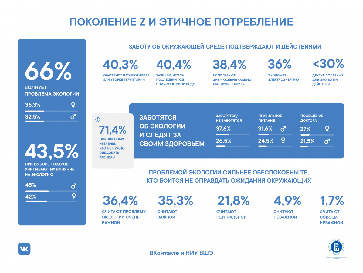 По данным отчета, обеспокоенность экологией и собственным здоровьем связана с ориентацией на ожидания родителей и друзей. Проблема экологии сильнее волнует тех, кто боится не оправдать надежд окружающих: 36,4% из них считают охрану природы очень важной, 35,3% — важной, 21,8% — нейтральной, 4,9% — неважной, 1,7% — совсем неважной. Среди тех, у кого нет страха подвести близких, доли «очень важно» и «важно» меньше (30,4 и 33,5%), а «нейтрально», «неважно» и «совсем неважно» — больше (24,8; 8,6 и 2,7% соответственно).