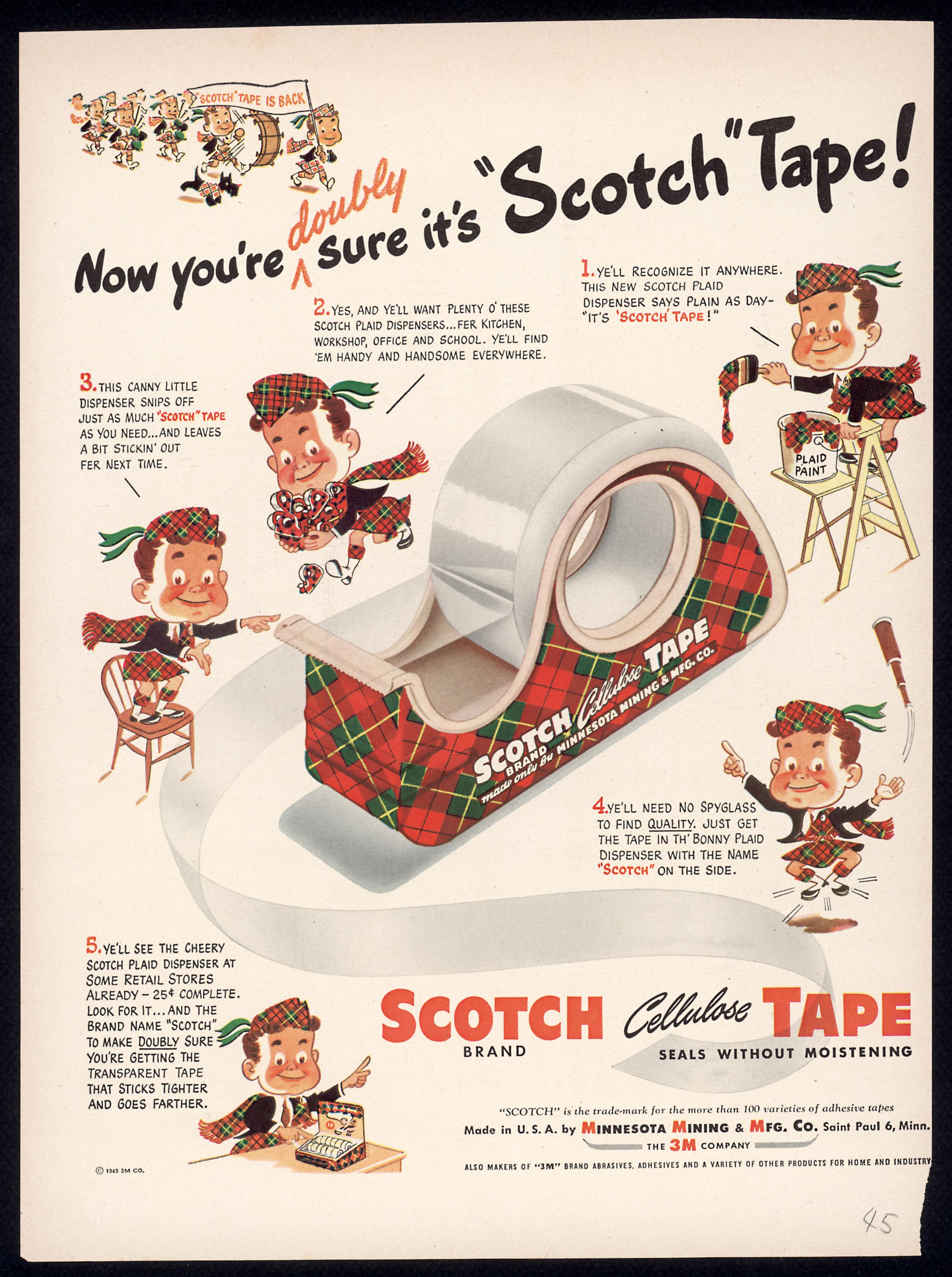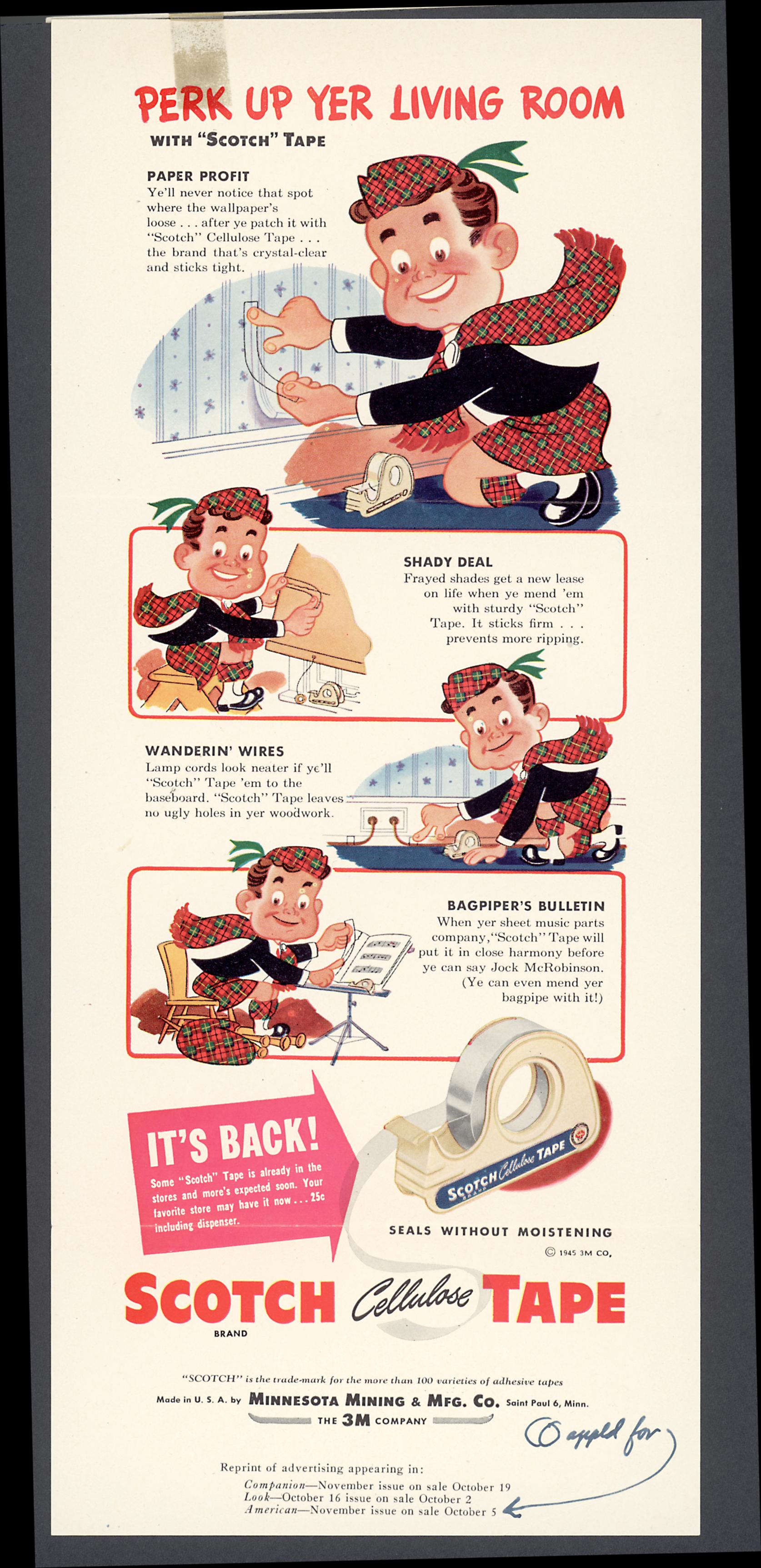 Торговая марка Scotch® получила патент, защищающий это изобретение, а смешной мультипликационный герой в шотландской юбке-килте, объясняющий как можно чинить вещи и чистить одежду с помощью клейкой ленты Scotch, стал рекламным лицом торговой марки.